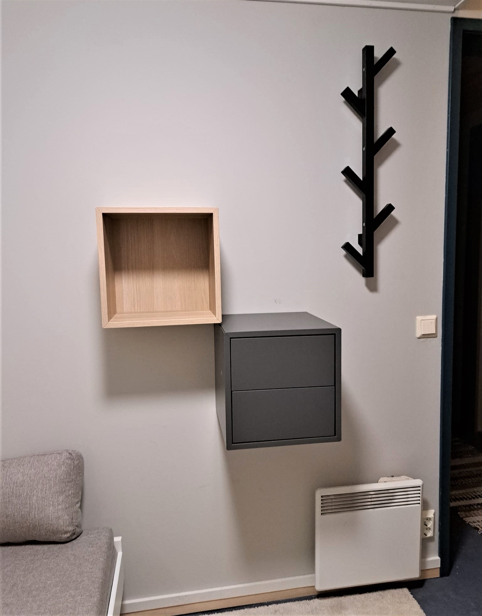 Maanläheiset sävyt tuovat tilaan rauhan. Pehmeä matto tuo kivan lämpöisen tunnelma, sama matto laitettiin myös parvelle. Valkoiset kalusteet ja pieni ripaus puun sävyä siellä täällä, tuo raikkauden. Pienen apupöydän saa näppärästi nostettua kahvan ansiosta pois tieltä kun sänky levitetään.