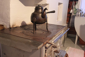 Vanha pirtin puuhellässä keitetään esimerkiksi jouluna kunnon pannukahvit ja joulupukkikin on käynyt vierailulla.