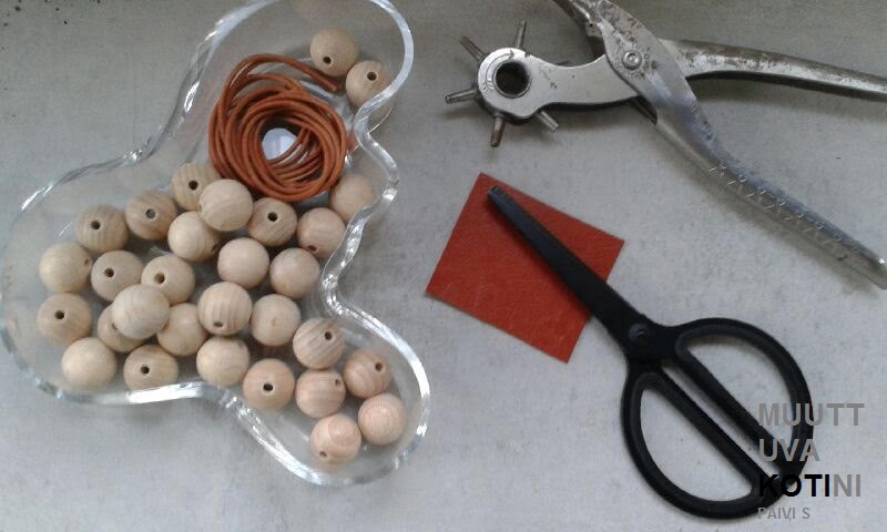 Pari puuhelmeä, nipsutin ja nahkanaru, saa kivan ripustimen esim. pyyhkeille.